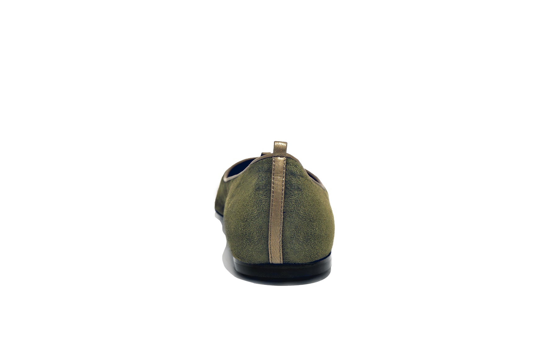 Front view of Isabella Kron Julie Flat in palude green suede, classic ballet silhouette